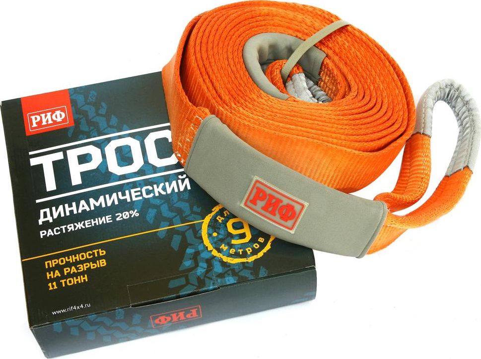 Длина динамического троса РИФ 9 метров. Разрывная нагрузка 11 тонн. Растяжение 20%.
